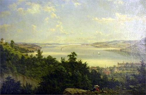 AN OIL ON CANVAS; An amorous couple on a rock ledge overlooking a long lake, signed and date lower right "F. Deb Richards, 12(?)" 14"h x 21 1/2"w