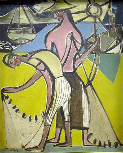 AN OIL ON CANVAS; depicting a Picasso-esque couple on the beach, signed l.l. Menkes (Zygmunt (Sigmund) Menkes, Polish, 1896-1986). Together with a modernistic oil on board of a couple in colorful attire, signed l.l. Gopal. 2 pieces.