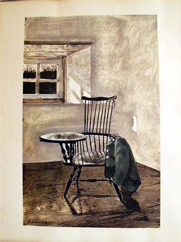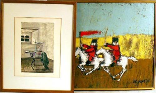 The Cossacks, bears signature lr Ted Wredt (sp?) `64. 20"h x 24"w. Together with a reproduction Wyeth print of a writing-arm Windsor chair. 2 pieces.