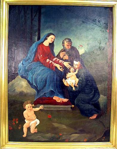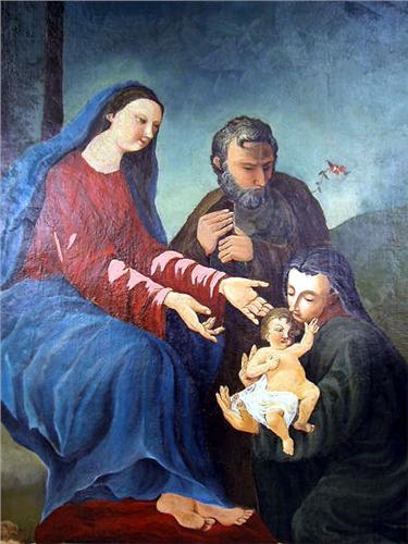 Depicting Peter, Mary, and baby Jesus, attributed to Caracci. Re-lined and repaired. 41"h x 31 1/4"w.