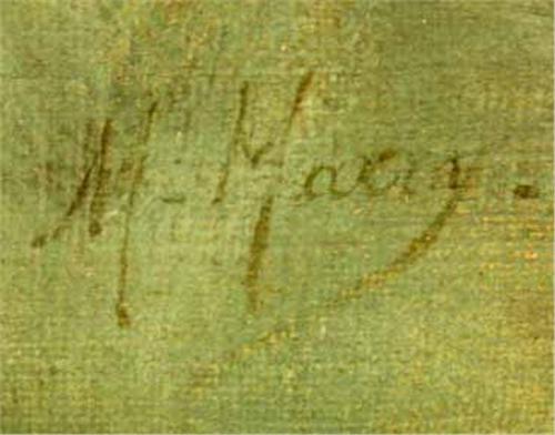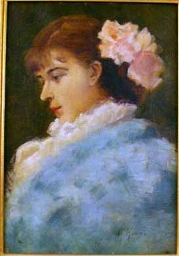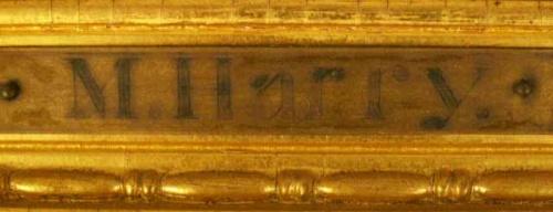 Portrait of a young woman with pink flowers in her hair, bears signature lr M. Harry, brass plaque reads M. Harry. 11"h x 7"w.