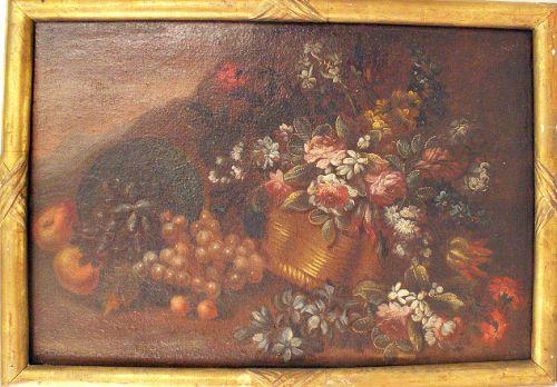 Continental, probably Dutch, floral still life with basket and fruit. 19"h x 28 1/2"w.
