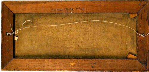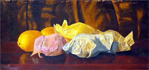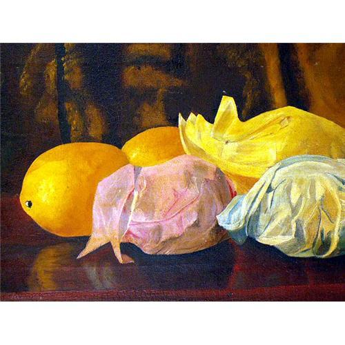 Still life with lemons, printed on wood stretcher "J Voy & Martha Merrill". Paint loss. 16 1/4"h x 11 1/4"w.