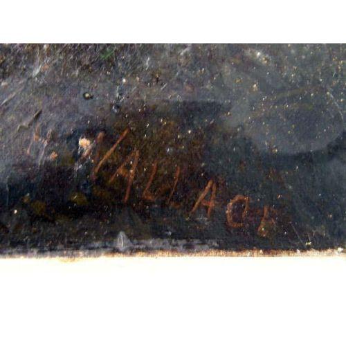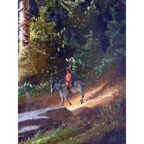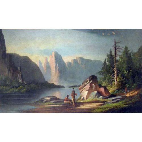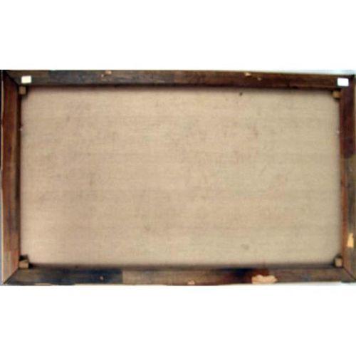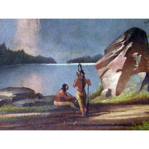 AN OIL ON CANVAS<BR><BR>Depicting a river landscape with Native Americans, signed l.r. H. Wallach(?), losses to paint, unframed, 29"h x 50"w