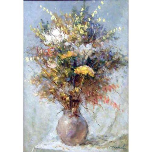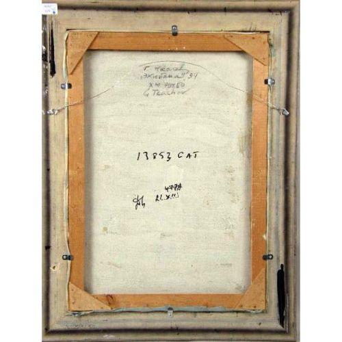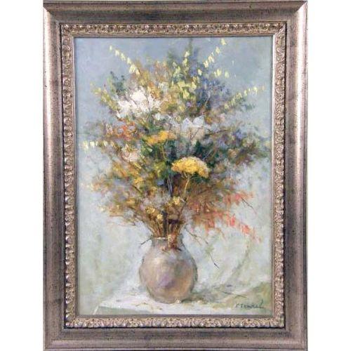 AN OIL ON CANVAS<BR><BR>Of a floral still life, G. Tcachou, bears signature l.r. in Cyrillic characters, the verso titled and dated `94, 28"h x 20"w
