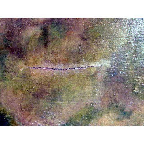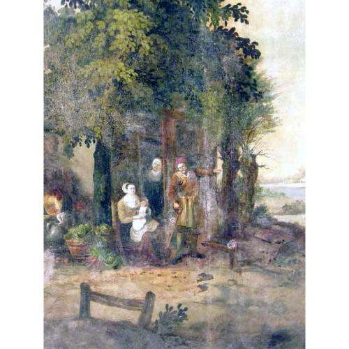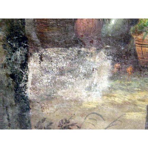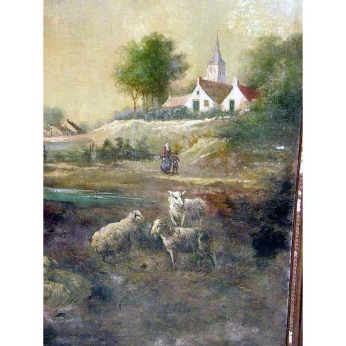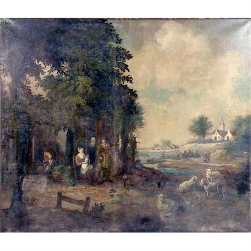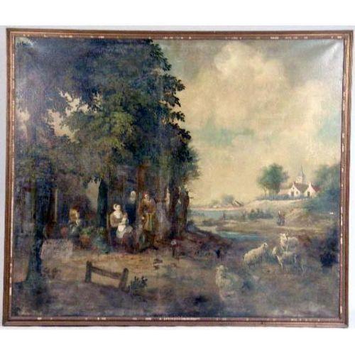 AN OIL ON CANVAS<BR><BR>Depicting figures and animals in a landscape, possibly Dutch, with houses distant, apparently unsigned, surface distressed, losses to frame, 5`6"h x 6`6"w