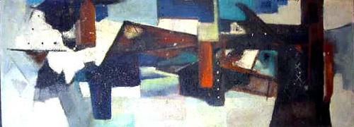 AN OIL ON MASONITE; Steelscape, signed l.l. Thalinger F.I.A.L. (E. Oscar Thalinger, American, 1885 - 1965). Verso with an old exhibition label from the St. Louis Artists Guild, noting the price to be $325.00. Together with a black-and-white abstract oil o