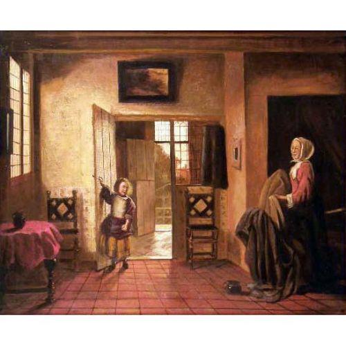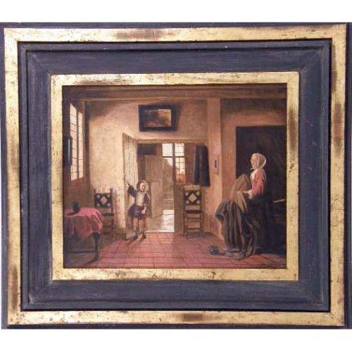 AN OIL ON MASONITE<BR><BR>Depicting a Dutch interior with figures, 14-1/2"h x 17-1/2"w
