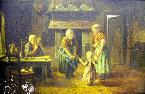 AN OIL ON MILK GLASS FAMILY SCENE; Signed lr, Artz 24"h x 32"l, losses