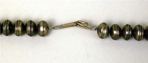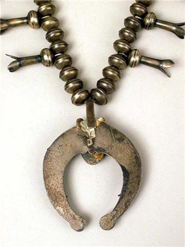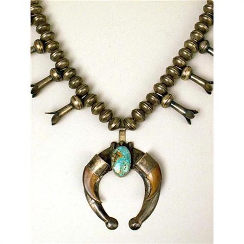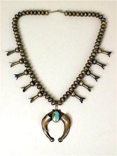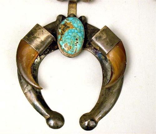 A single row of compressed globular beads interspersed with ten blossom pendants, suspending a naja with center bezel set oval green turquoise, flanked by two bear claws. Naja 3"l, necklace 26 1/2"l.