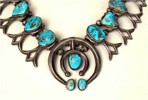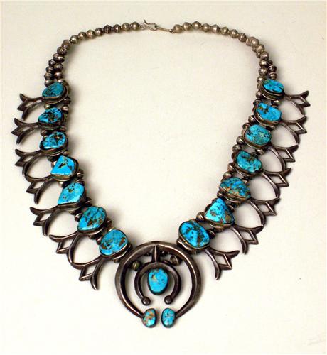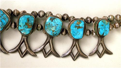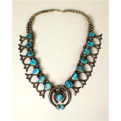 Compressed globular beads interspersed with fourteen blossom pendants, each with bezel set large flattened turquoise nugget, suspending a double naja, center of loof, oval bezel set turquoise stone, terminals set with oval bezel set turquoise stone, all d