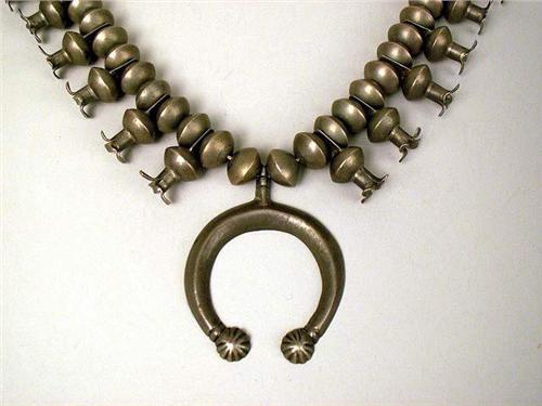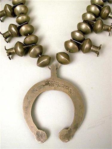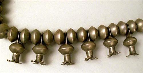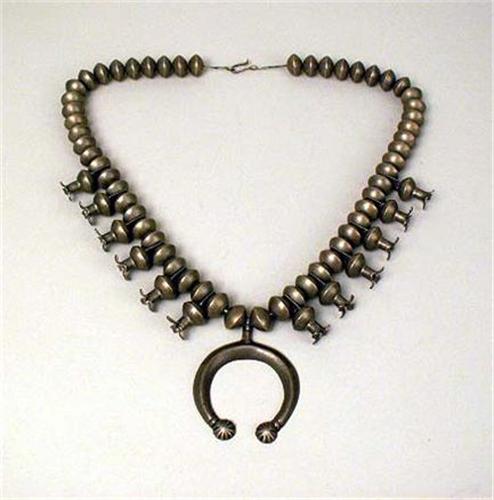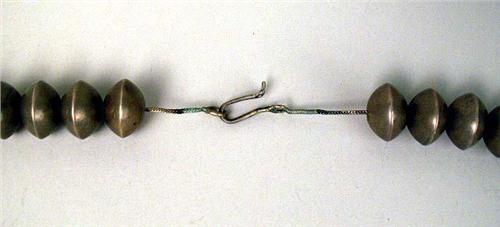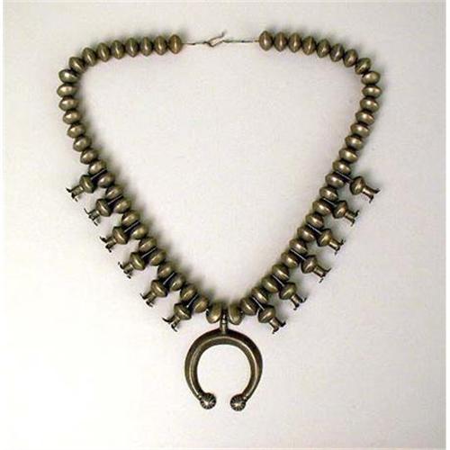 Compressed globular beads interspersed with twelve silver blossoms, suspending a naja with rosette terminals. Naja 2 3/4"l, necklace 27"l.