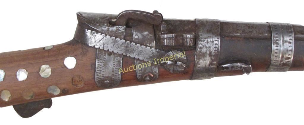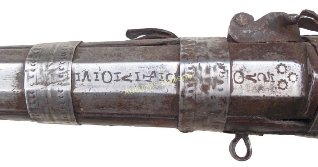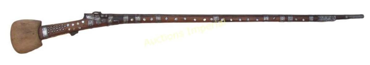 With applied rounded butt and engraved iron mounts, set with mother of pearl disks from butt to forearm . Barrel with spurious European markings and maker’s marks in the form of a gear. Mid 19th century. Worn overall. Overall length 154 cm.
