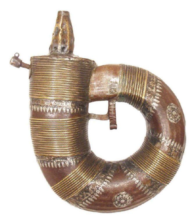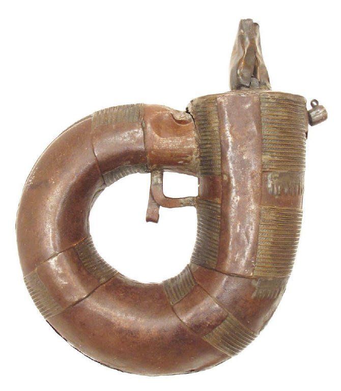 Of characteristic form, wrought of tooled cooper with brass wire bands and appliques.Mid-19th century. Overall length 19.7 cm. Condition III