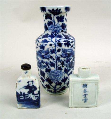 AN ORIENTAL BLUE AND WHITE VASE, dragon and flower motif, 6-1/4"h, together with 2 porcelain Oriental snuff bottles, 2-1/2"h