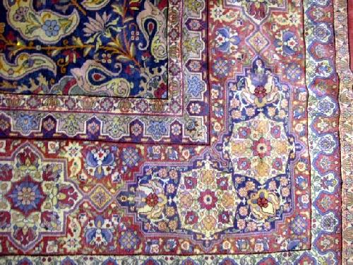 AN ORIENTAL CARPET; Red ground, blue and ivory tones with allover geometric motif, apr. 13' x 10'