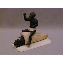 AN ORIENTAL OKIMONO, ivory and ebony, formed as a blackamoor over a dog emerging from a kennel, length 12cm 50-80