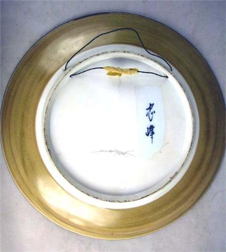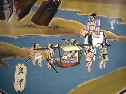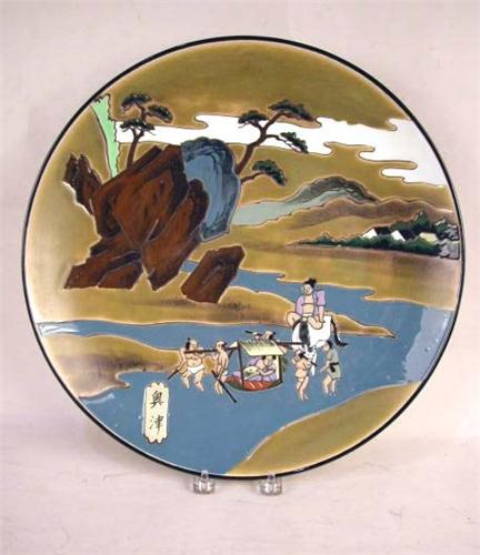 AN ORIENTAL STYLE CHARGER Depicting a river landscape of men carrying their Emperor across a river, 14 1/2"dia.