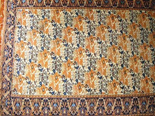 AN ORIENTAL STYLE RUG; Ivory, blue ground with allover floral and geometric design, 63" x 46"