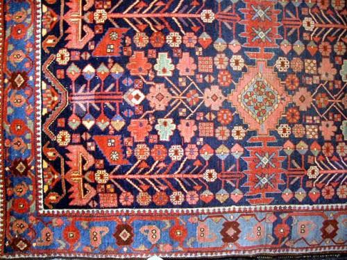 AN ORIENTAL STYLE RUG; Blue ground with allover floral and geometric design, 76" x 48"