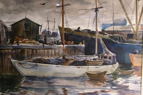 AN ORIGINAL WATERCOLOR TITLED "MARINE"; Depicting a sailboat named Helen and Agatha at dockside, Signed LL Claude Montgomery