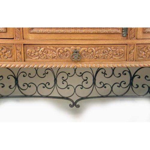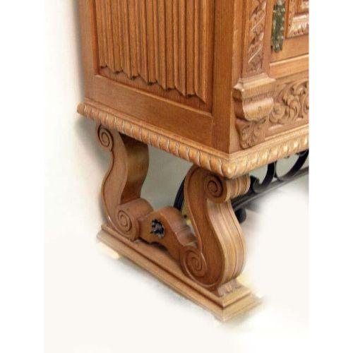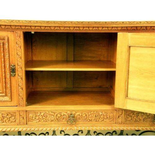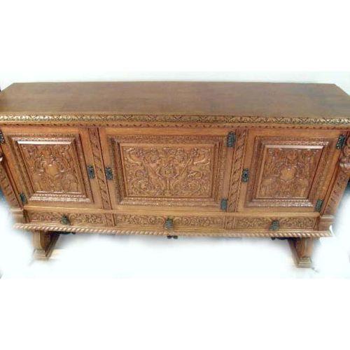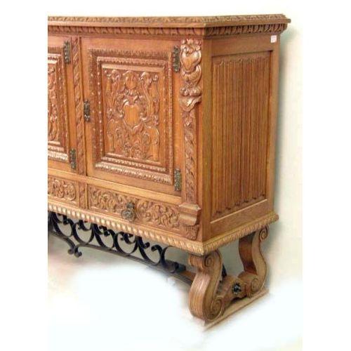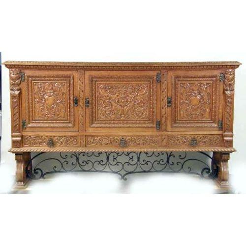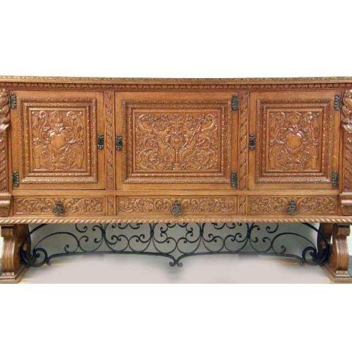 AN ORNATE RENAISSANCE-STYLE CREDENZA OR SIDEBOARD<BR><BR>Adorned with mythical creatures and armorial crests. 48" h x 87" w x 22" d.