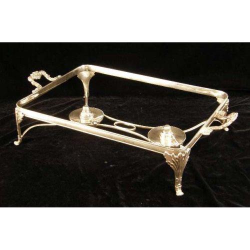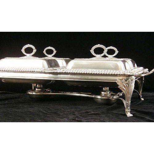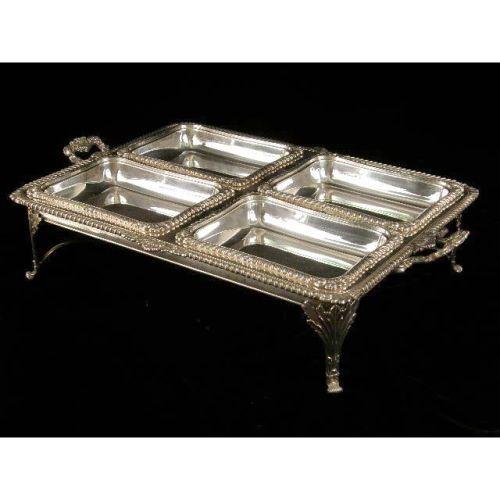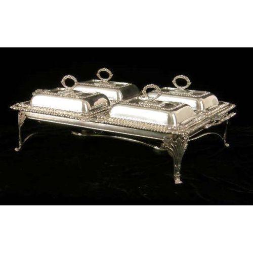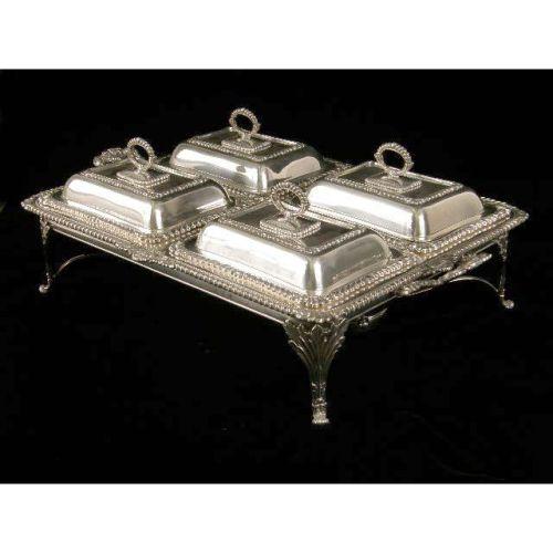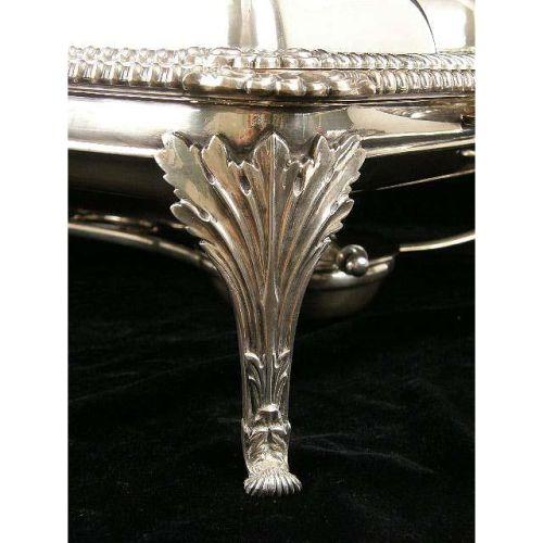 AN ORNATE SHEFFIELD FOOTED HANDLED DINNER SERVICE<BR><BR>With four covered entree dishes, tray and stand, gadrooned borders, acanthus and shell decorated legs, 5-1/2"high x 27"long over handles x 16-1/2"wide