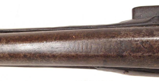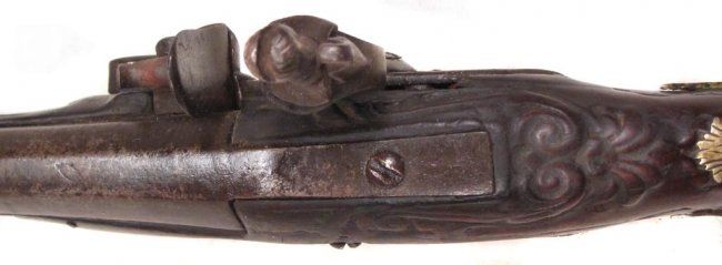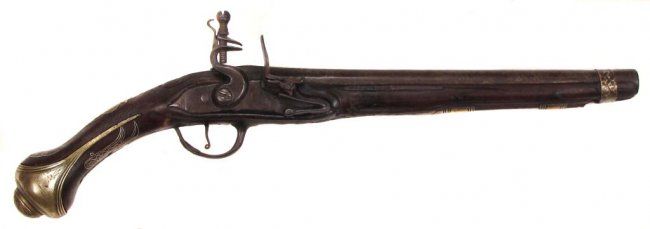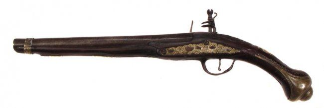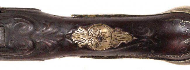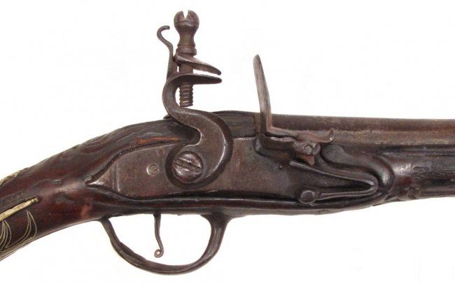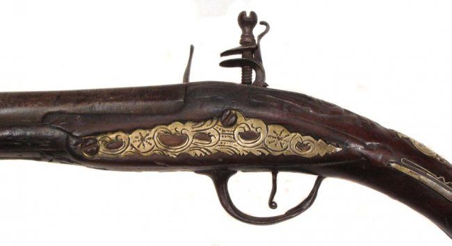 Of robust form, with hardwood stock and brass furniture. Wire inlay. Mid-18th century. Some wear. Overall length 44 cm.