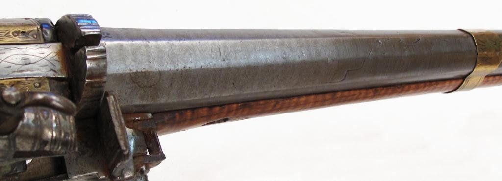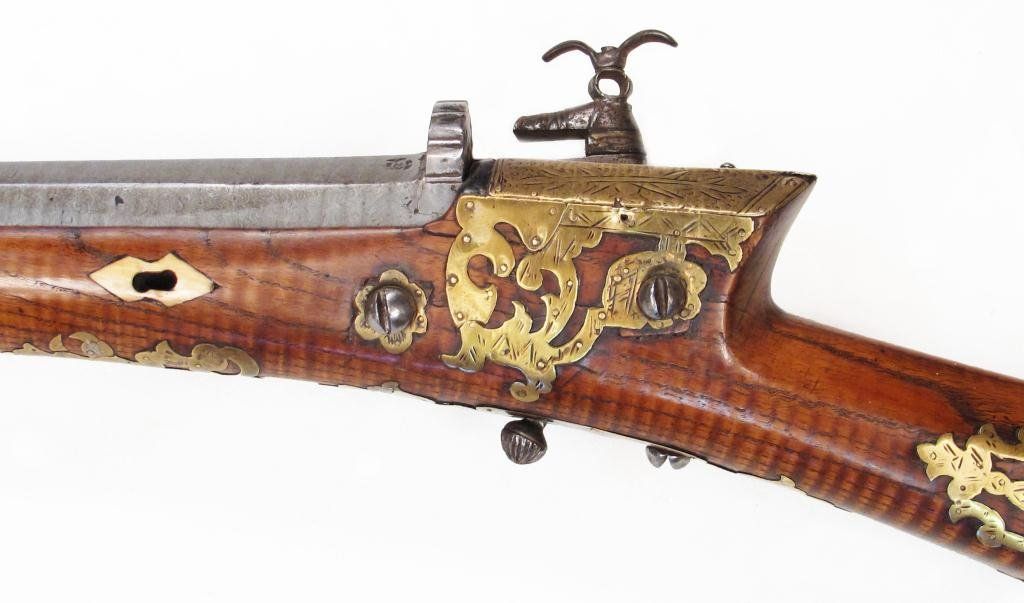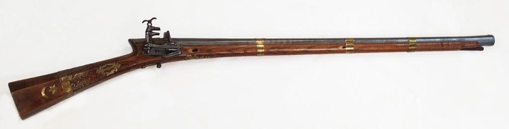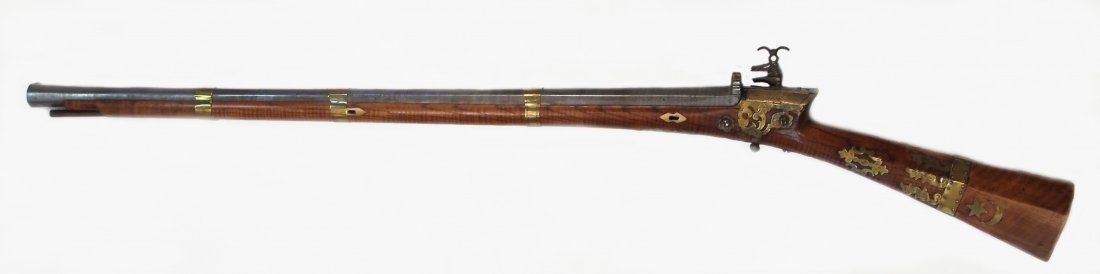 The actively-grained hardwood stock of characteristic form, inlaid with brass appliques, including the crescent moon and star. The miquelet lock with profiling, the heavy, octagonal barrel forged of fine pattern-welded damascus steel with triangular rear site, the edges scrolled. Late18th century.Overall length 113.8 cm. Condition II