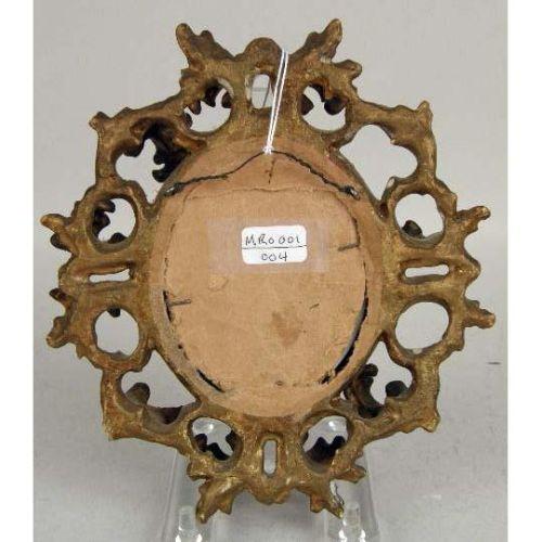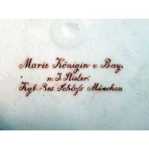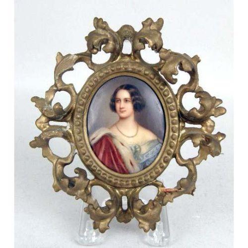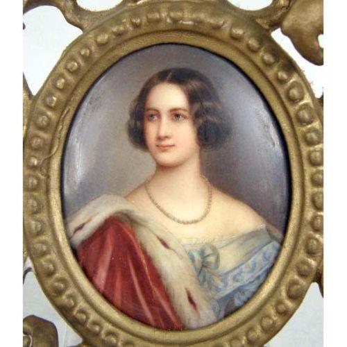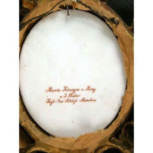 AN OVAL FRAMED PORCELAIN PLAQUE DEPICTING A LADY WEARING PEARLS<BR><BR>marked on verso," Marie Konigin V Bay n.j. Nieler Kab Res Leblege Minchen, 3"h