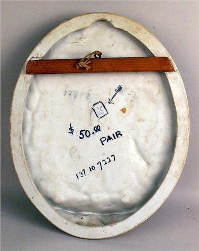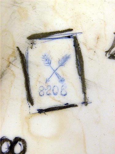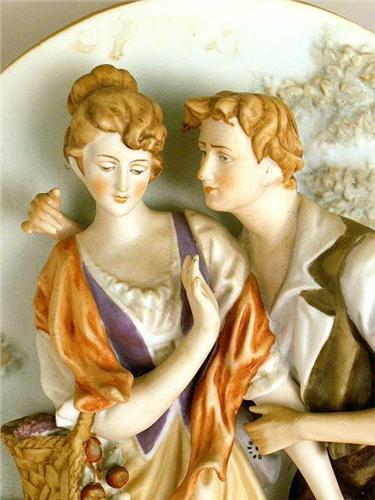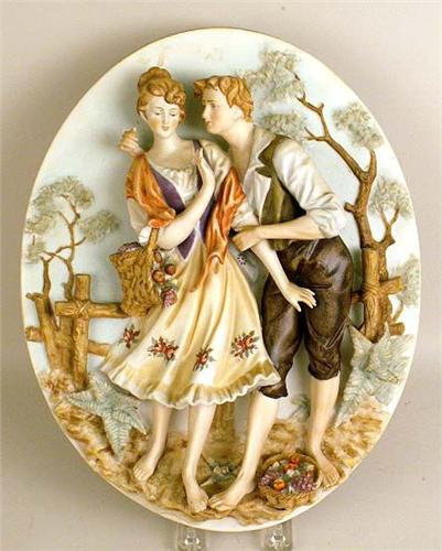 With a figural scene in relief, underside marked with blue crossed arrows, and the a number, possibly Kalk, Eisenberg, Thuringia, Germany (E.Germany?), 12"h x 10"w