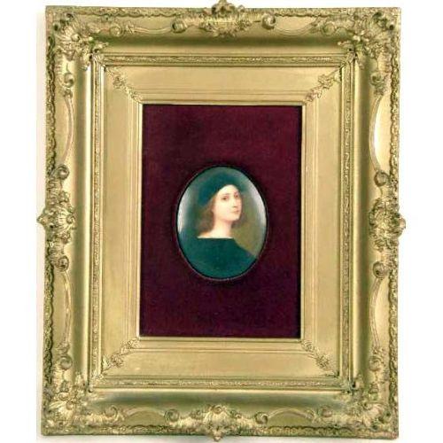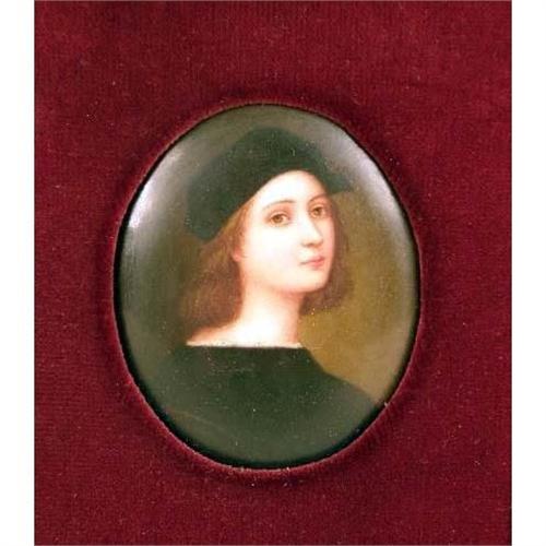 AN OVAL PORCELAIN PLAQUE DEPICTING A RENAISSANCE GENTLEMAN WEARING A BLACK HAT<BR><BR>bears an illegible stamp on verso, glued to mat , 3"h