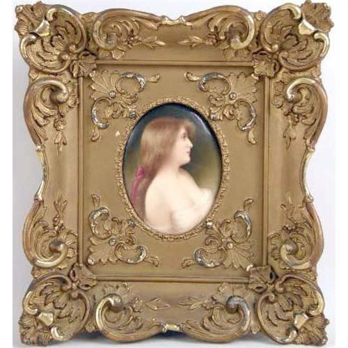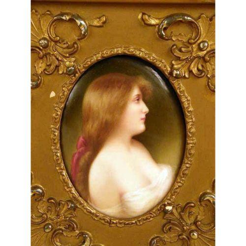 AN OVAL PORCELAIN PLAQUE OF A MAIDEN WITH A MAROON BOW<BR><BR>signed R. Wagner, framed, 5"h