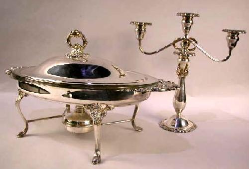 AN OVAL WALLACE SILVER PLATED BAROQUE STYLE COVERED CHAFING DISH ON CABRIOLE LEGS; Joined by burner, glass insert 12 1/2"h x 23 1/2"w Together with a pair of Wallace three light candelabras, one with losses, 14"h