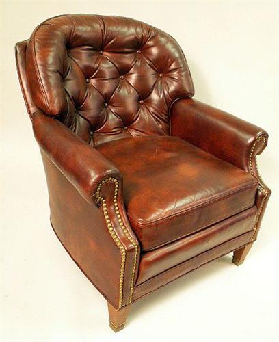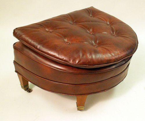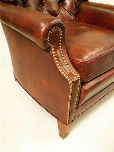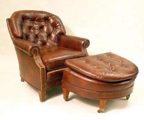 AN OXBLOOD RED LEATHER UPHOLSTERED CLUB CHAIR AND DEMI-LUNE OTTOMAN