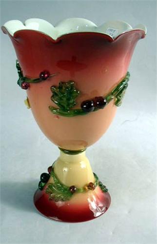 AN PEACHBLOW VASE; Cranberry to peach, applied berries and leaves, flared scalloped rim, cream interior, joined at base with glass disc, 11"h, losses