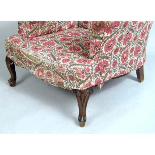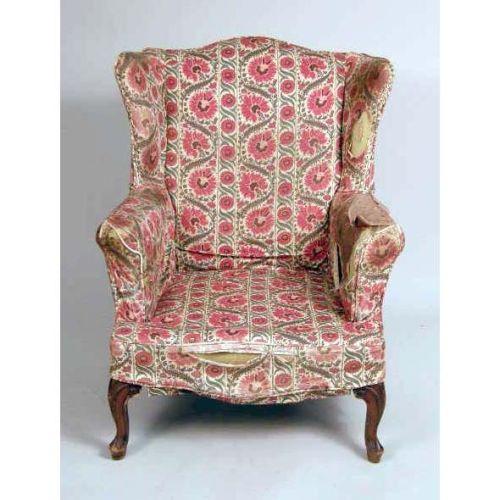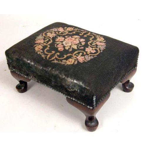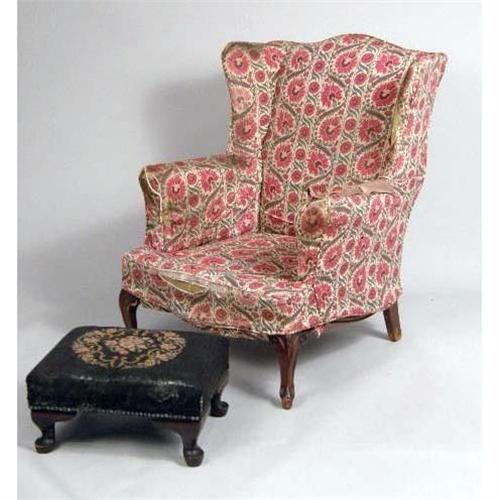 AN QUEEN ANNE STYLE MAHOGANY WING CHAIR<BR><BR>together with a needlepoint-embroidered footstool. The chair 37" high. 2 pieces.