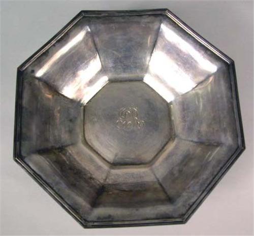 AN R. WALLACE STERLING SILVER OCTAGONAL BOWL; With three letter scroll monogram, 10"dia., total weight 12 T.O.