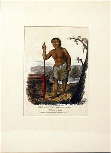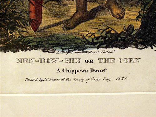 Inscribed "Men-Dow-Min or The Corn, A Chippewa Dwarf, after James Otto Lewis (American, 1799-1858) at the Treaty of Green Bay, 1827". Tears and losses. Provenance: Sotheby`s, New York, William Guthman Collection of Manuscript, Printed and Graphic Ame