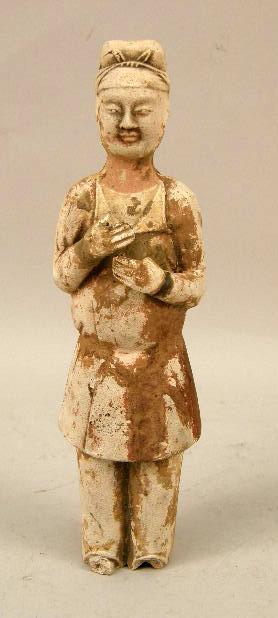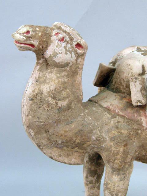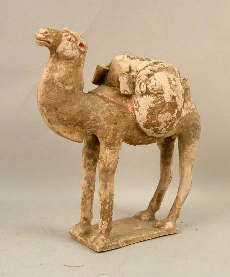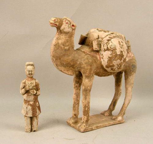 Together with an unglazed Tang-style tomb figure of a man. Camel 15"h x 13 1/2"l x 7"w, man 9"h Man`s left hand broken and repaired, left foot missing tip. Camel rocks on base.
