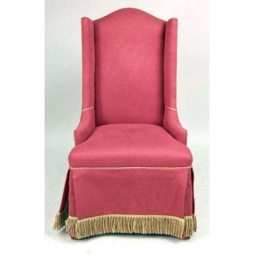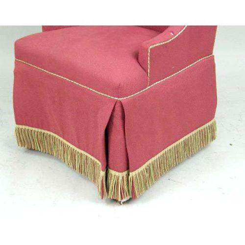 AN UPHOLSTERED WING CHAIR<BR><BR>With red upholstery and gold fringe, 43"h