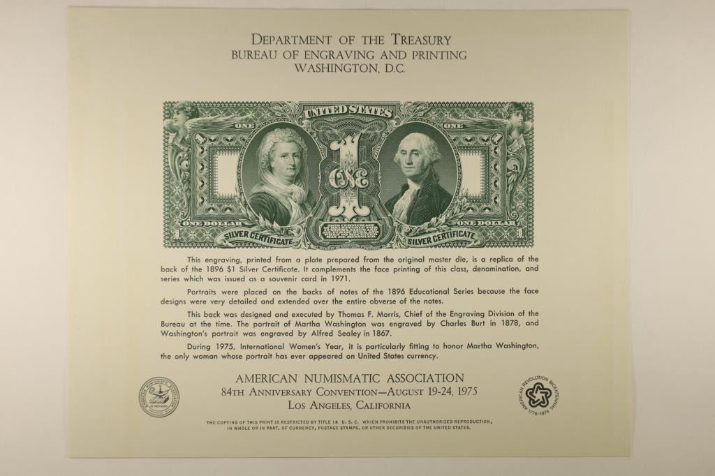 FEATURING: AN ENGRAVING OF A REVERSE 1896 US $1 SILVER CERTIFICATE, PRINTED BY THE BUREAU OF ENGRAVING AND PRINTING