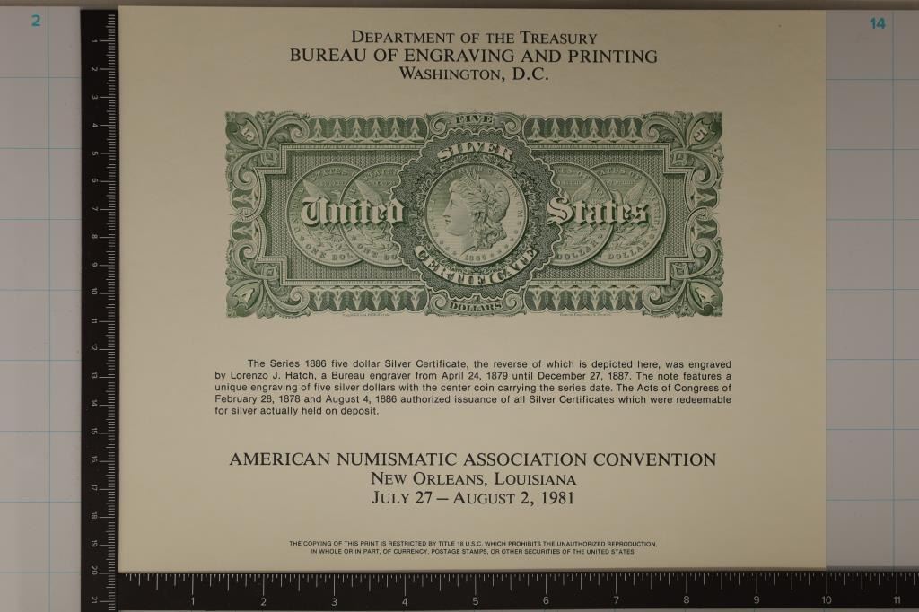 THE REVERSE OF AN 1886 $5 SILVER CERTIFICATE, PRINTED BY THE BUREAU OF ENGRAVING AND PRINTING