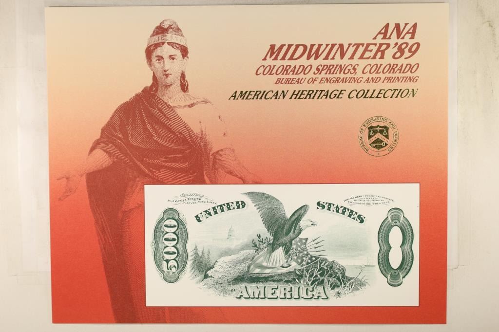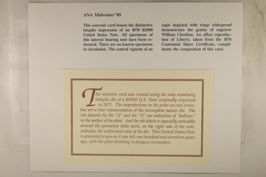 SOUVENIR CARD FEATURING THE REV. OF A US 1872 $5000 NOTE, CARD WAS CREATED USING THE ONLY REMAINING INTAGLIO DIE OF A $5000 US NOTE, PRINTED BY THE BUREAU OF ENGRAVING AND PRINTING