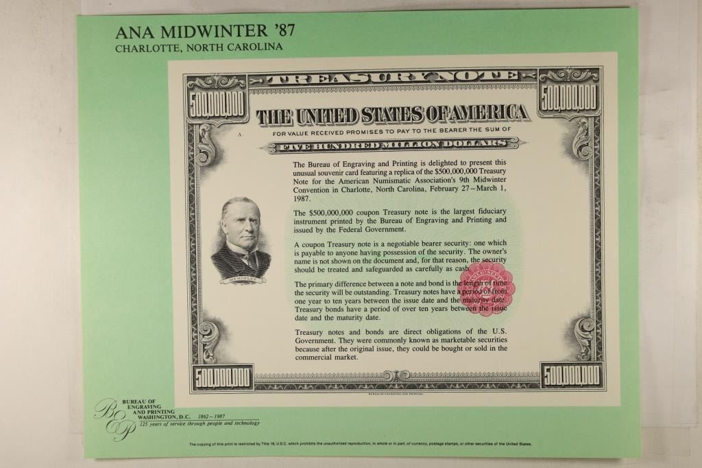 SOUVENIR CARD, WITH PRINTING OF 500 MILLION DOLLARS UNITED STATES OF AMERICA TREASURY NOTE BY THE BUREAU OF ENGRAVING AND PRINTING