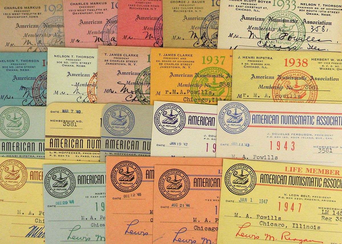 American Numismatic Association. ANA MEMBERSHIP CARDS ISSUED TO M.A. POWILLS FROM 1929 TO 1947. Twenty cards, including every year from 1929 to 1947, with two cards present for 1946, indicated when Powills switched to a Lifetime Membership. Through 1936, the cards are entirely filled out by hand; beginning with 1937, the member’s name, number and address is typewritten. All cards are signed by the ANA General Secretary by hand: Harry T. Wilson, M. Vernon Sheldon and Lewis M. Reagan are the General Secretaries represented. Fine. A neat group of ANA memorabilia, complete for the period covered. Powills joined the ANA in 1929, so the set is complete through 1947. Today, few coin people recognize the name of Chicagoan Michael A. Powills (1906-86). He was extremely active in American Numismatic Association politics and affairs (he ran unsuccessfully for the Board twice in the late 1940s), however, making his set of membership cards all the more desirable.