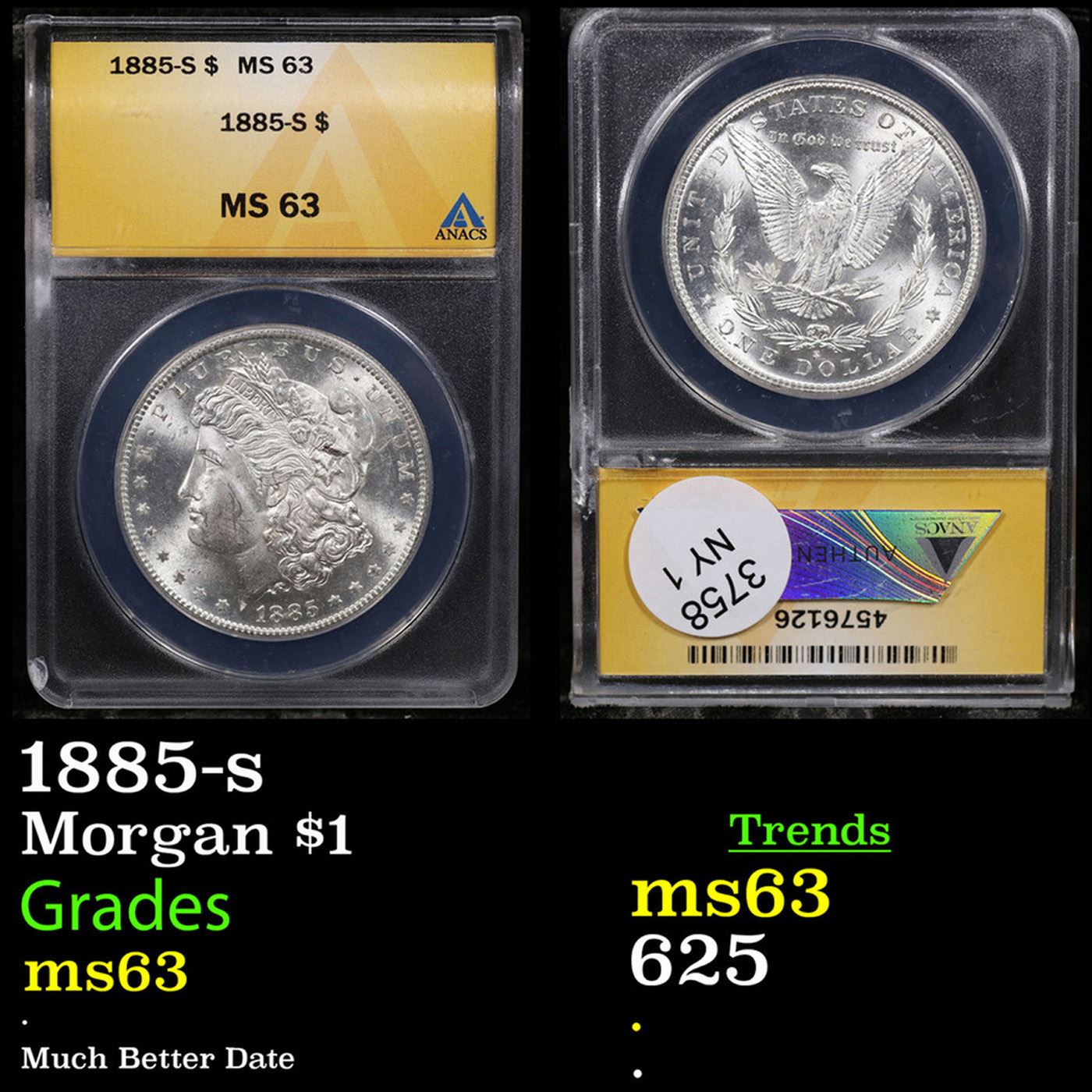 ANACS 1885-s Morgan Dollar $1 Graded ms63 By ANACS. 0