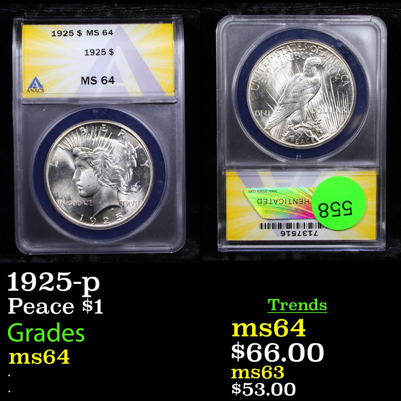 ANACS 1925-p Peace Dollar $1 Graded ms64 By ANACS.