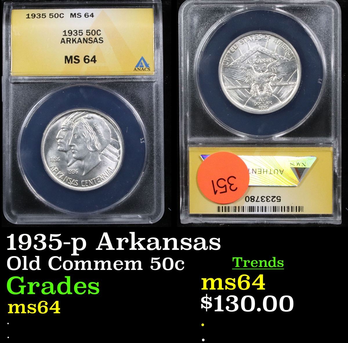 ANACS 1935-p Arkansas Old Commem Half Dollar 50c Graded ms64 By ANACS.