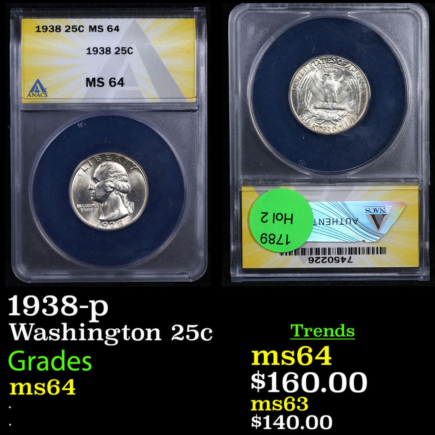 ANACS 1938-p Washington Quarter 25c Graded ms64 By ANACS.
